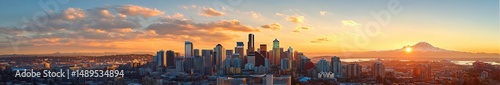Obraz premium Panoramic view of a city skyline at sunset with towering skyscrapers, a...