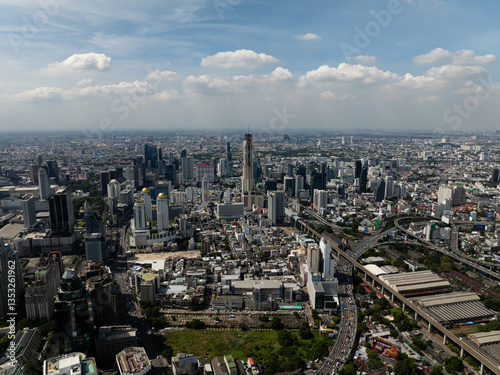 © MARYGRACE, Obraz premium Panoramic view of a city skyline highlighting urban greenery and tall buildings under a bright sky. Bangkok, Thailand.