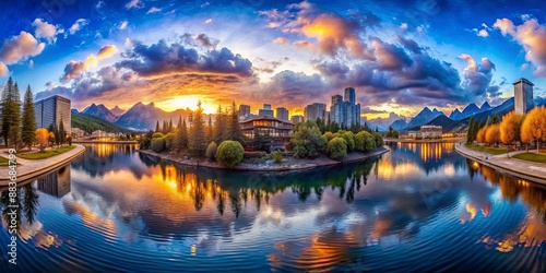 Fototapeta premium Panoramic View of a Cityscape with a Mountain Range and a Lake Reflection,...