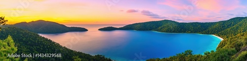 Fototapeta premium Panoramic view of a colorful sunset over a calm sea or lake,created by ai