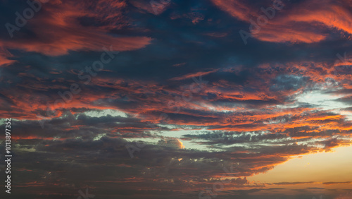 © Andrii_Abriutin, Fototapeta premium Panoramic view of a dramatic sunset sky with vibrant orange and deep blue clouds.