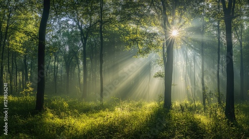© Badass Prodigy, Obraz premium Panoramic view of a forest in spring with sun rays.