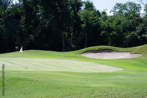 © Marco B., Fototapeta premium Panoramic view of a golf course with greens and sand bunkers surrounded by tropical plants in Mexico