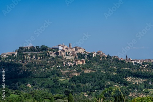 © Wirestock, Fototapeta premium Panoramic view of a hilltop town under a clear blue sky