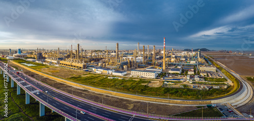 © zhao dongfang, Fototapeta premium Panoramic view of a large oil refinery and chemical plant complex with a highway.
