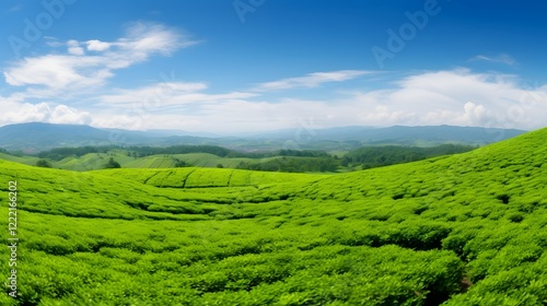 Fototapeta premium Panoramic view of a lush green tea field stretching out under a clear blue sky The rolling hills and valleys create a serene and picturesque landscape