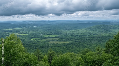 © Art Jabz, Obraz premium Panoramic view of a lush green valley, rolling hills, and distant mountains under a cloudy sky