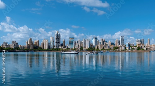 © ALIS ST, Obraz premium Panoramic View of a Modern City Skyline Reflected in Calm Waters Under a Bright Blue Sky