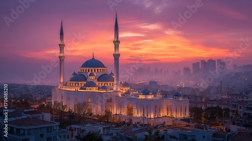 © BANDERSOUL, Naklejka premium Panoramic view of a mosque at dawn with soft morning light