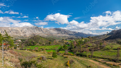 Naklejka premium Panoramic view of a mountain river and a small village, valley. Mountain...