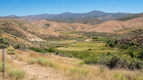 Naklejka premium Panoramic view of a serene valley nestled between arid hills and distant mountains under a clear blue sky. Lush greenery thrives in the valley bottom, contrasting with the dry landscape