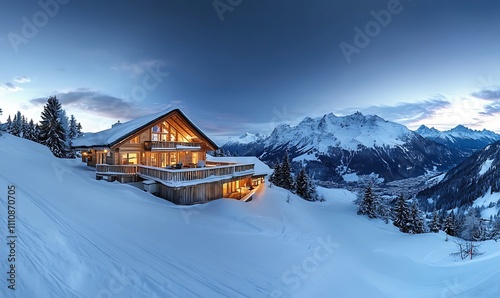 Naklejka premium Panoramic view of a ski chalet in the mountains, perfect for winter and...