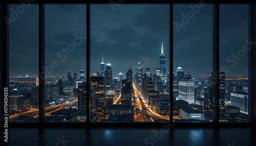 © Kath Gulap, Obraz premium Panoramic view of a sprawling city skyline at night seen through large office building windows