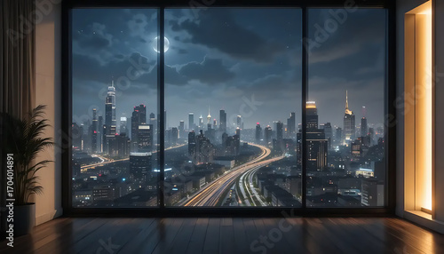Fototapeta premium Panoramic view of a sprawling futuristic city skyline at night under a cloudy moonlit sky
