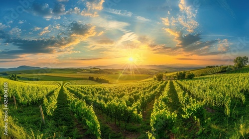 © Stock Spectrum, Fototapeta premium panoramic view of a summer vineyard at sunset. green vineyard rows at sunset
