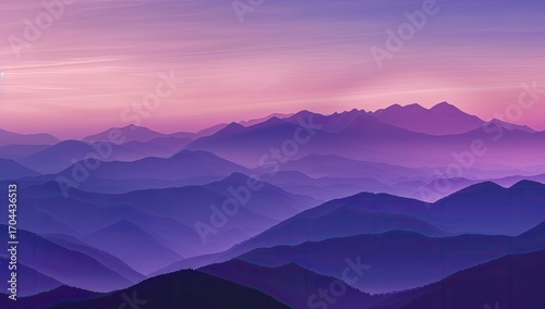Fototapeta premium Panoramic view of a vast mountain range at dawn or dusk, showcasing a gradient of purple and blue hues across numerous layers of peaks and valleys, veiled in a soft mist or haze