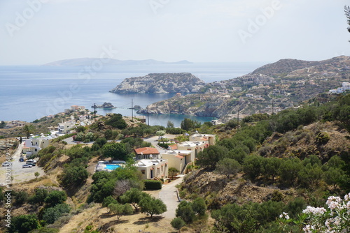 Fototapeta premium Panoramic view of Agia Pelagia in Crete, Greece from above with the blue sea...