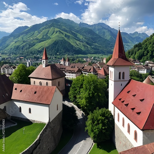 © Liang, Obraz premium Panoramic View of Alpine Village with Churches and Mountains