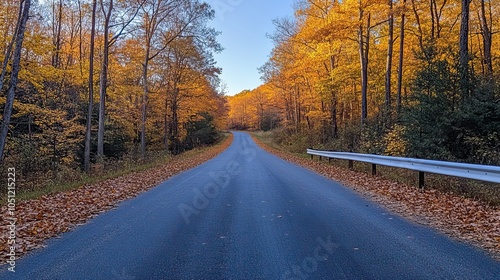 © Thoa, Obraz premium panoramic view of an autumn forest road, with bright sunlight and white guardrail alongside.image
