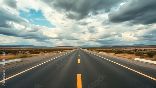 © Graphics, Naklejka premium Panoramic view of an empty road under cloudy skies, capturing a serene and open landscape.