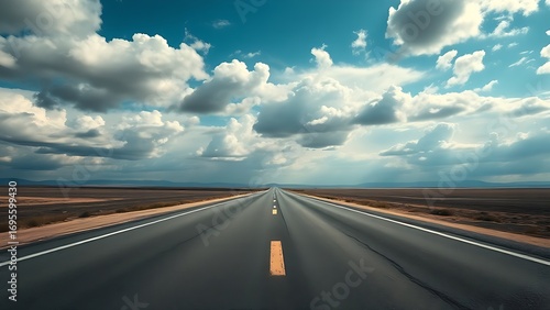 © Wendy, Fototapeta premium Panoramic view of an empty road under cloudy skies, capturing a serene and open landscape.