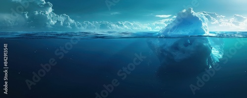 Naklejka premium Panoramic view of an iceberg partly submerged in the deep blue ocean under a...