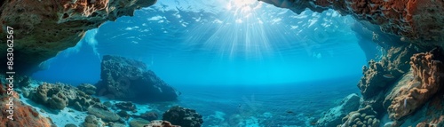 © ngstock, Fototapeta premium Panoramic view of an underwater cave with sunlight streaming through clear blue waters and vibrant marine life.
