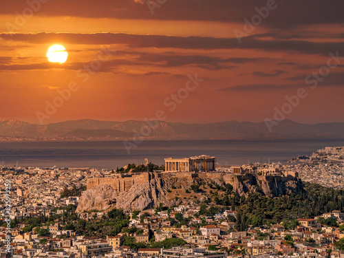 Obraz premium Panoramic view of Athens with Parthenon on the Acropolis and the Saronic sea in the background under a fiery sky. Travel to Greece.