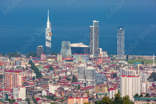 Fototapeta premium Panoramic view of Batumi city with modern towers and Black Sea coastline in...