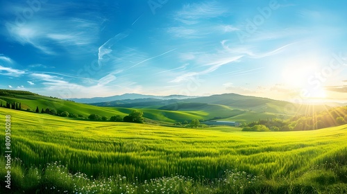 Obraz premium Panoramic view of beautiful endless green fields in bright sunlight, Italy