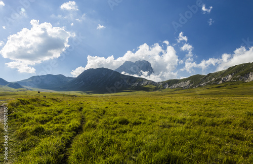 Fototapeta premium Panoramic view of beautiful landscape with Gran Sasso d'Italia peak at Campo...