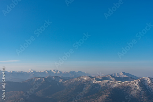 © Shawn.ccf, Fototapeta premium Panoramic view of beautiful mountain landscape, snowy mountain peaks covered by forest with a dark blue clear sky background in spring time sunny day