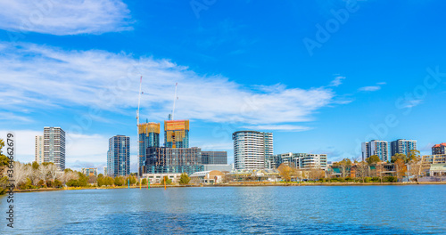 Naklejka premium Panoramic view of Belconnen town centre looking across Lake Ginninderra on a sunny day in Canberra, the capital of Australia