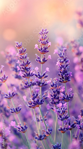 Naklejka premium Panoramic view of blooming purple lavender fields. Symbol of beauty, calmness, and natural aromatherapy. Serene floral landscape radiating fragrance, freshness, and seasonal elegance.