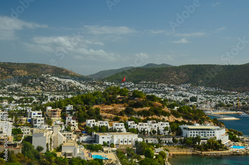 Naklejka premium Panoramic View of Bodrum downtown, traditional white houses marina. Landscape of Traditional Bodrum Aegean architecture style . Vacation in Turkey