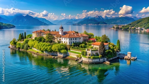 Fototapeta premium Panoramic view of Borromee islands on Lago Maggiore with lush greenery and picturesque villas surrounded by water , borromee islands, italian lakes