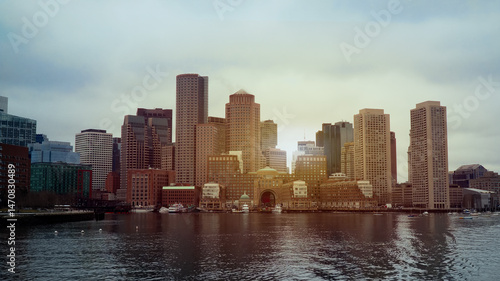 © 4kclips, Fototapeta premium Panoramic view of Boston skyline reflecting on the water with skyscrapers and modern buildings during a beautiful sunset