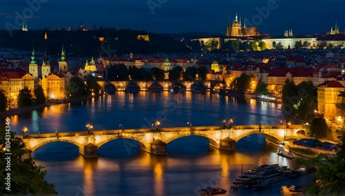 Fototapeta premium Panoramic view of bridges on Vltava river in Prague at night