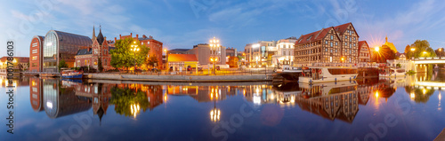 Naklejka premium Panoramic view of Bydgoszcz waterfront at dusk, showing historic and modern buildings along the Brda River in Poland