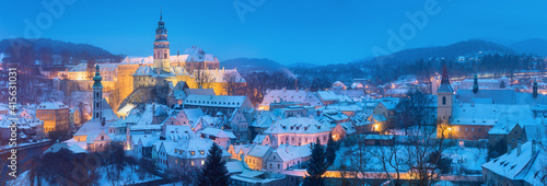 © Michal, Obraz premium Panoramic view of Cesky Krumlov in winter season, Czech Republic. View of the snow-covered roofs. Travel and Holiday in Europe. Christmas time. Historical houses and streets. UNESCO World Heritage