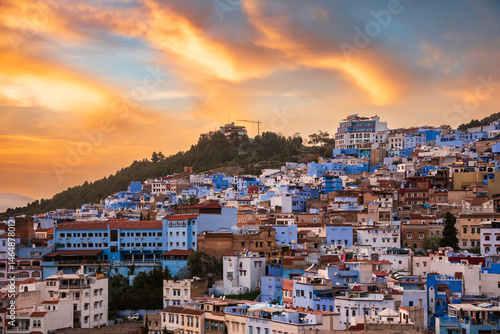 © Maresol, Obraz premium Panoramic view of Chefchaouen, Morocco. The blue city on sunset