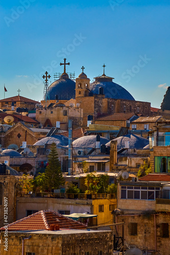 © Kira, Fototapeta premium Panoramic view of Church of Holy Sepulcher from roof Austrian Hospice of Holy Family, refuge for itinerant pilgrims, was opened in 1854 by Catholic Church of Austria in Holy Land. Jerusalem, Israel
