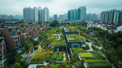© K'kriang Krai, Obraz premium panoramic view of city featuring green rooftops and urban gardens