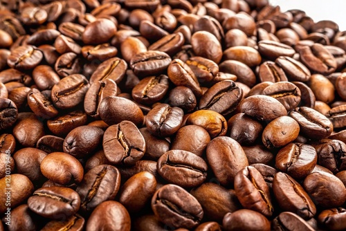 © Danicha, Naklejka premium Panoramic View of Coffee Beans Scattered on White Background