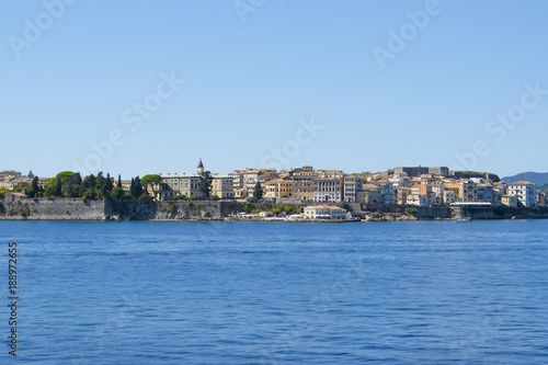 Naklejka premium Panoramic view of Corfu island from water. Castle and old town