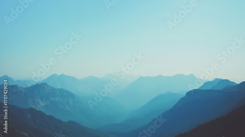 Obraz premium Panoramic view of distant mountain ranges, soft blue tones, hazy atmosphere