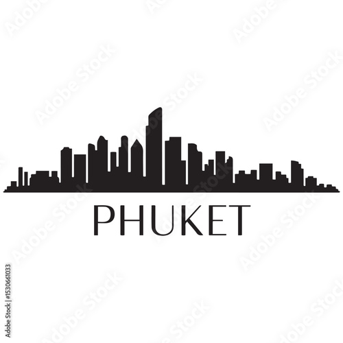 © firoz, Naklejka premium Panoramic View of Downtown Phuket Skyline. Phuket city black silhouette skyscrapers and buildings. Long cityscape. Vector black silhouette. with white background