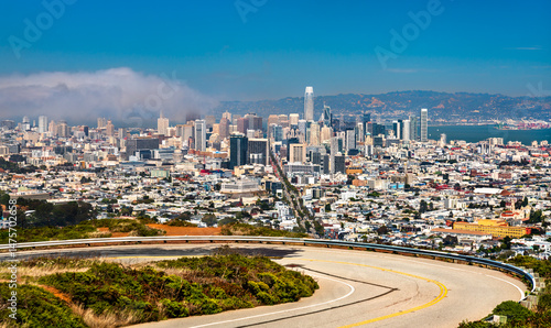 Obraz premium Panoramic view of downtown San Francisco from Twin Peaks, featuring iconic skyscrapers, urban density, coastal fog, and the curving summit roadway under a clear summer sky.