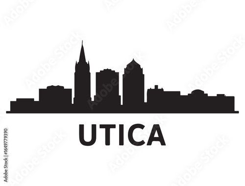 © Nargis, Naklejka premium Panoramic View of Downtown Utica Skyline. Utica city black silhouette skyscrapers and buildings. Long cityscape. Vector black silhouette. with white background