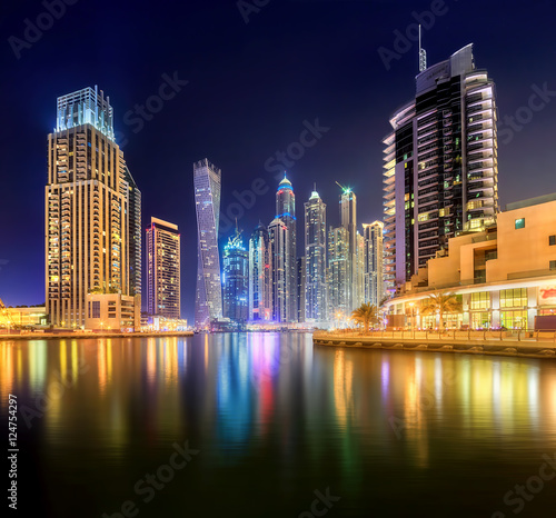 © boule1301, Fototapeta premium Panoramic view of Dubai Marina bay with yacht and cloudy sky, Dubai, UAE